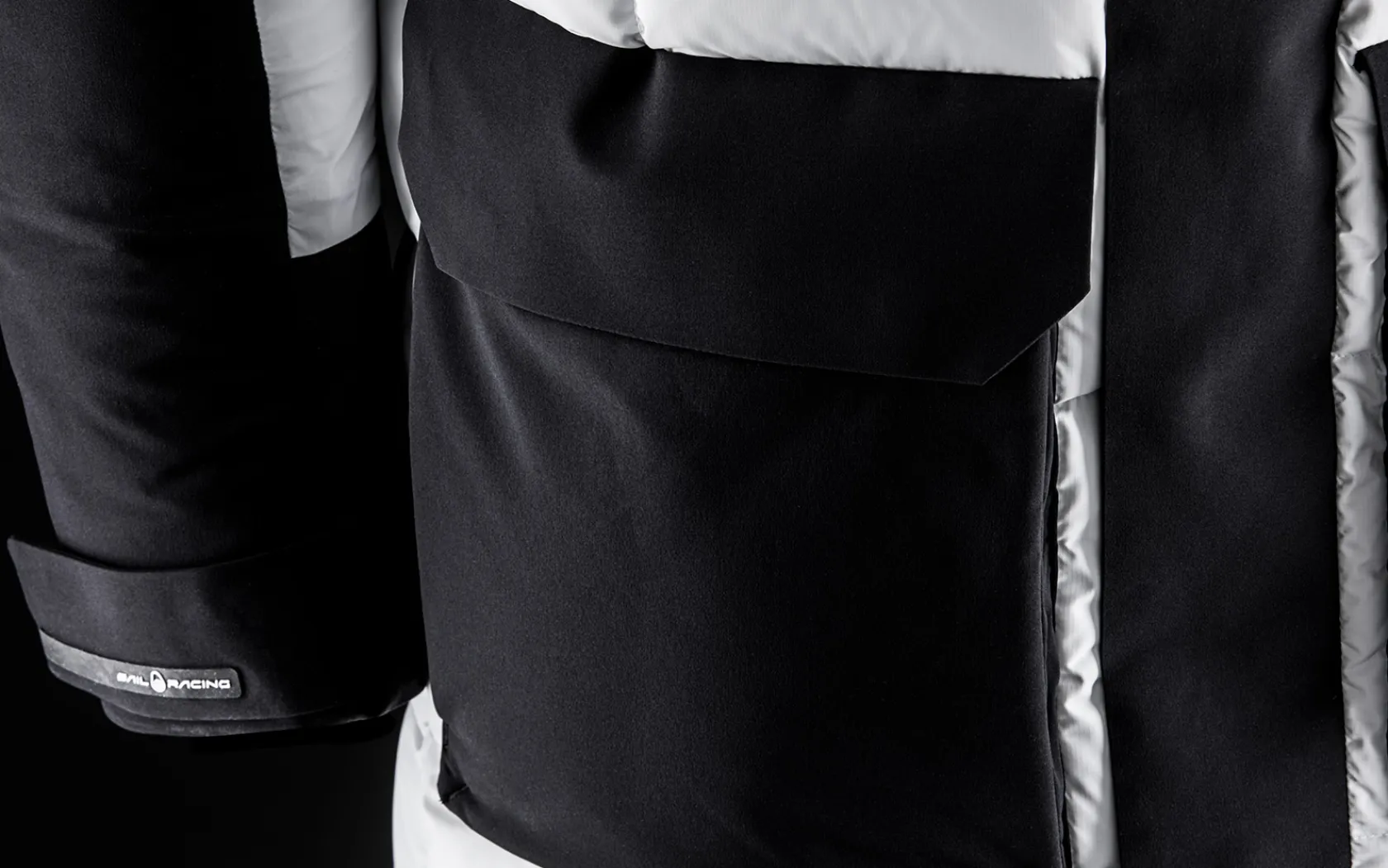 Antarctica tryck på insidan av ryggen och som märke på bröstfickan. Sail Racing logotyp finns placerad på huvan, bröstet samt hängöglan. Broderat Gore-Tex märke finns i nacken tillsammans med en Sail Racing logotyp. Svart reflextryck på ärmarna för synlighet. r