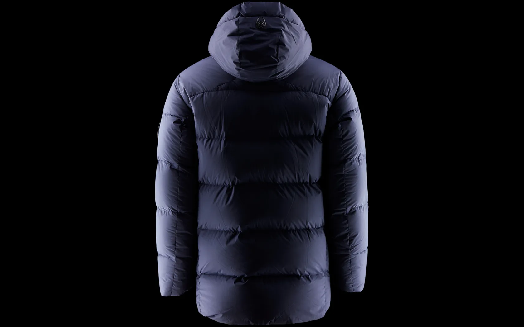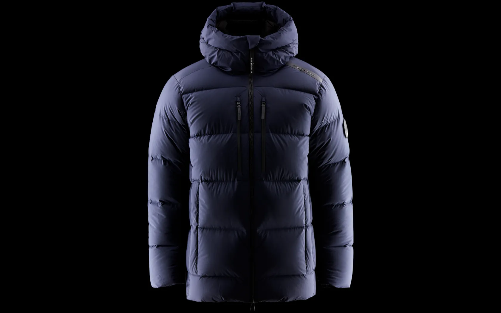 Hurricane Down Parka är en vindtät och vattenavvisande dunjacka tillverkad i en blandning av nylon och polyuretan. Unikt för jackans konstruktion är dess dubbla dunlager med överlappande dunkanaler för att minimera värmeförlusten. Jackan har hög andningsförmåga på 10 000 MVP samt ett invändigt foder i graphen-nylon för att optimera temperaturregleringen. För att ytterligare addera till jackans funktion, är den utrustad med en PFC-fri DWR-behandling med vattenavstötande egenskaper som förhindrar att yttertyget blir blött. Jackan är fylld med 90/10 Blue Sign och RDS-certifierat dun och fjädrar för värme och komfort i kalla vinterförhållanden. Fill power 700.r