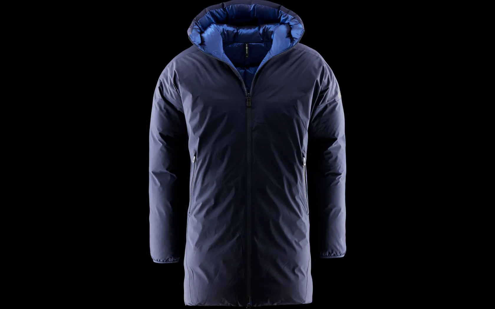 Jackan har en tvåvägs-dragkedja framtill vilket möjliggör en mer flexibel stängning. Huvan kan justeras med en dragsko baktill och har en dunfylld kanal runt öppningen för en mer anpassad passform som ytterligare skyddar mot väderpåfrestningar. Elastisk resår i ärmsluten för att skydda mot vindintrång. Den slätvävda sidan av jackan är utrustad med två rymliga midjefickor med dragkedjor, varav den quiltade sidan har två bröstfickor med knappstängning. Samtliga fickor har ett foder i borstad trikå för ökad komfort.
