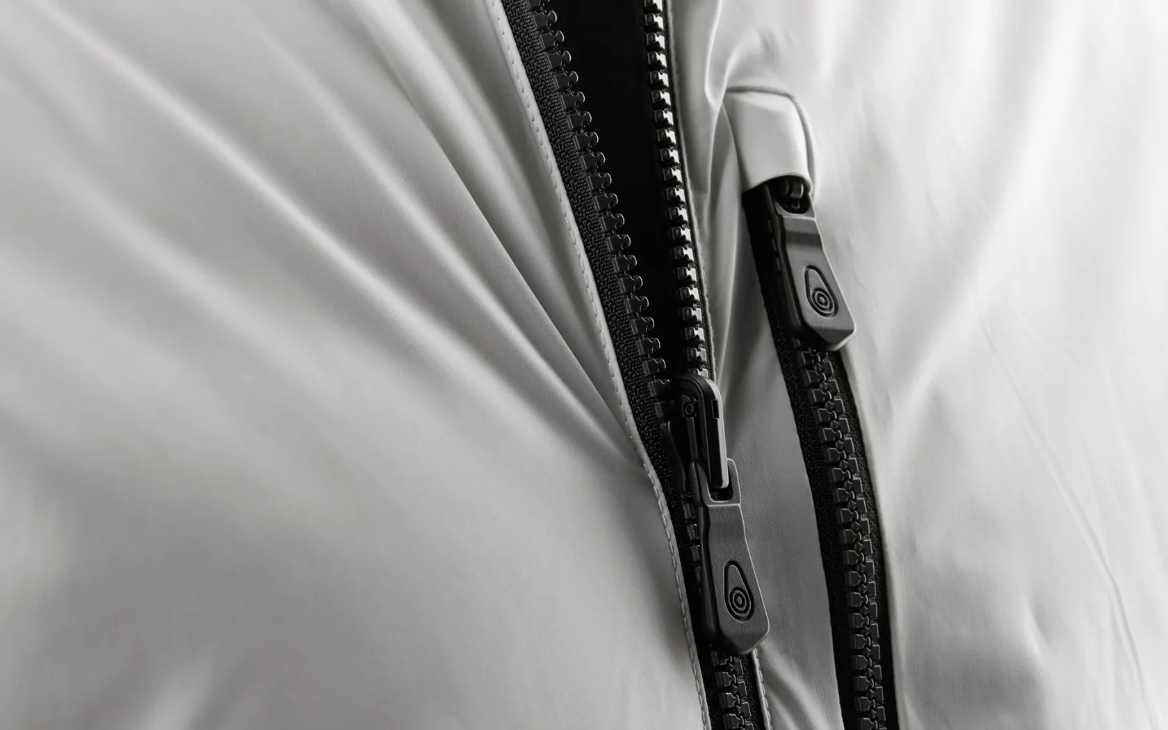 Thunder Reversible Parka är en vindtät och vattenavvisande dunjacka tillverkad av återvunnen nylon och spandex. Unikt för denna jacka är dess vändbara design, vilket ger användaren möjligheten att variera uttrycket i en och samma produkt. Den ena sidan har ett slätvävt tyg, medan motsatt sida har en quiltad design med metallisk lyster för ett sportigare uttryck.