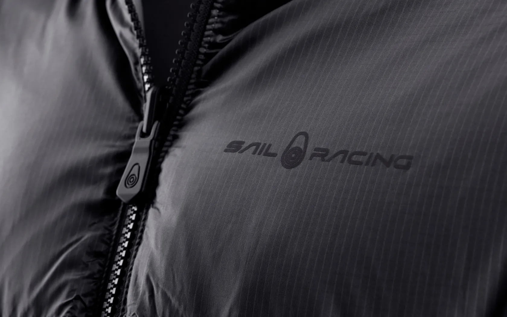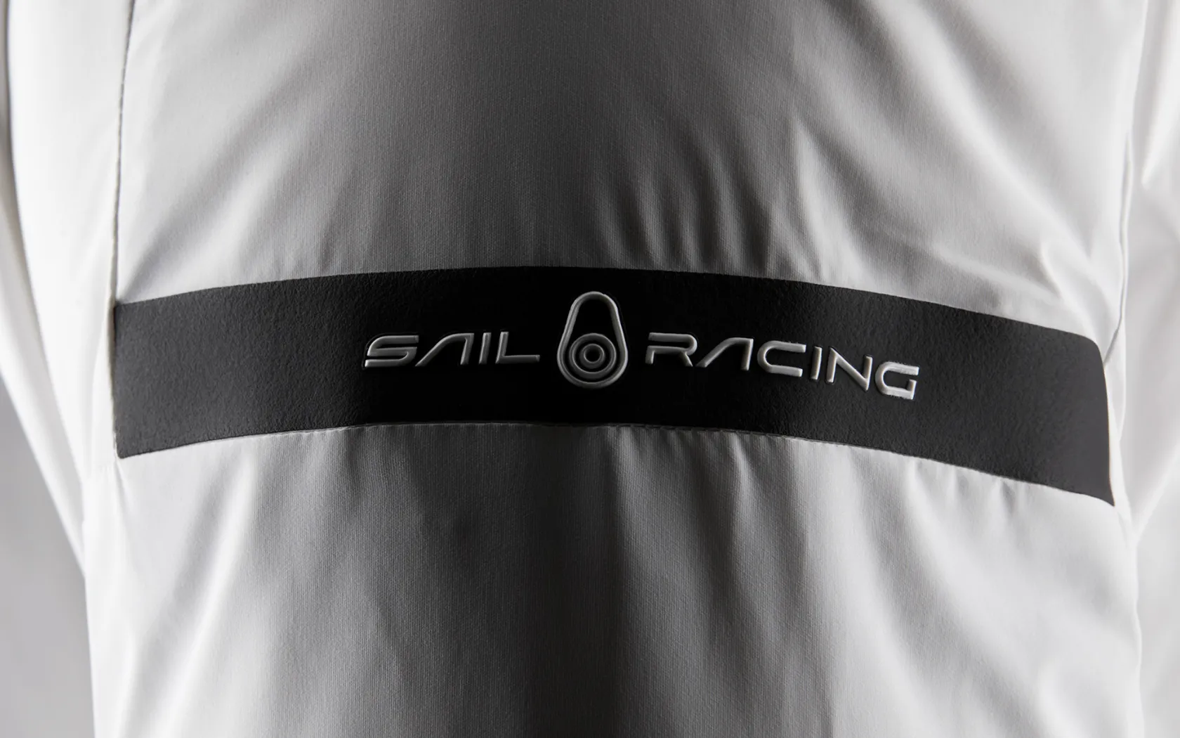 På den slätvävda sidan är jackan designad med en Sail Racing logotyp på vänster ärm och en block logotyp på den främre delen av huvan. Den quiltade insidan är designad med en tryckt Sail Racing logotyp på bröstet.