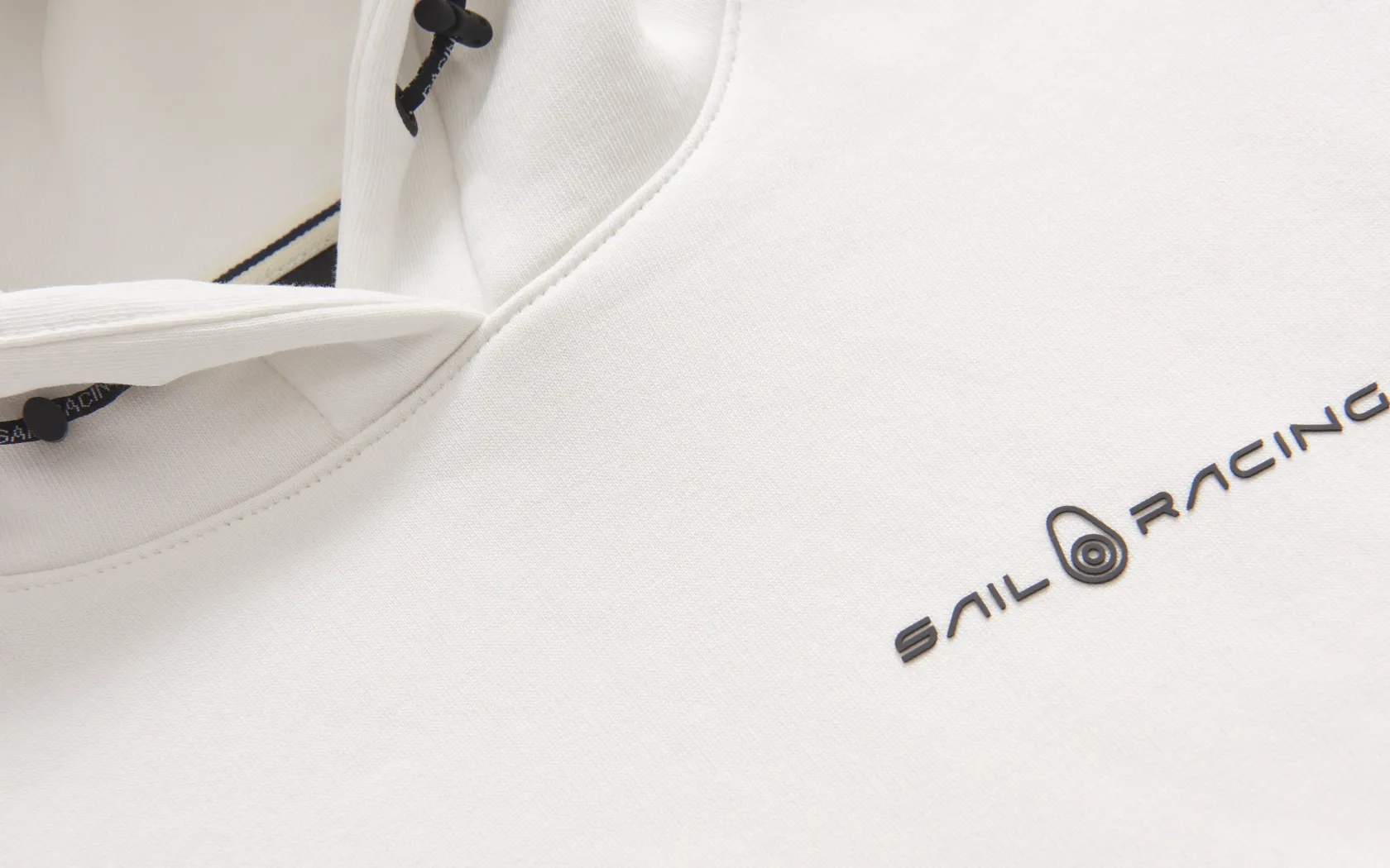 Women’s Gale Logo Hood tillverkad av BCI-bomull och återvunnen polyester. Huvan har en klassisk design med påsficka framtill, justerbar huva och ribbade muddar i ärmslut och nederkant. Sail Racing-logotyp i gummi på bröstet, i sidosömmen och bloc-logotyp upptill på huvan.