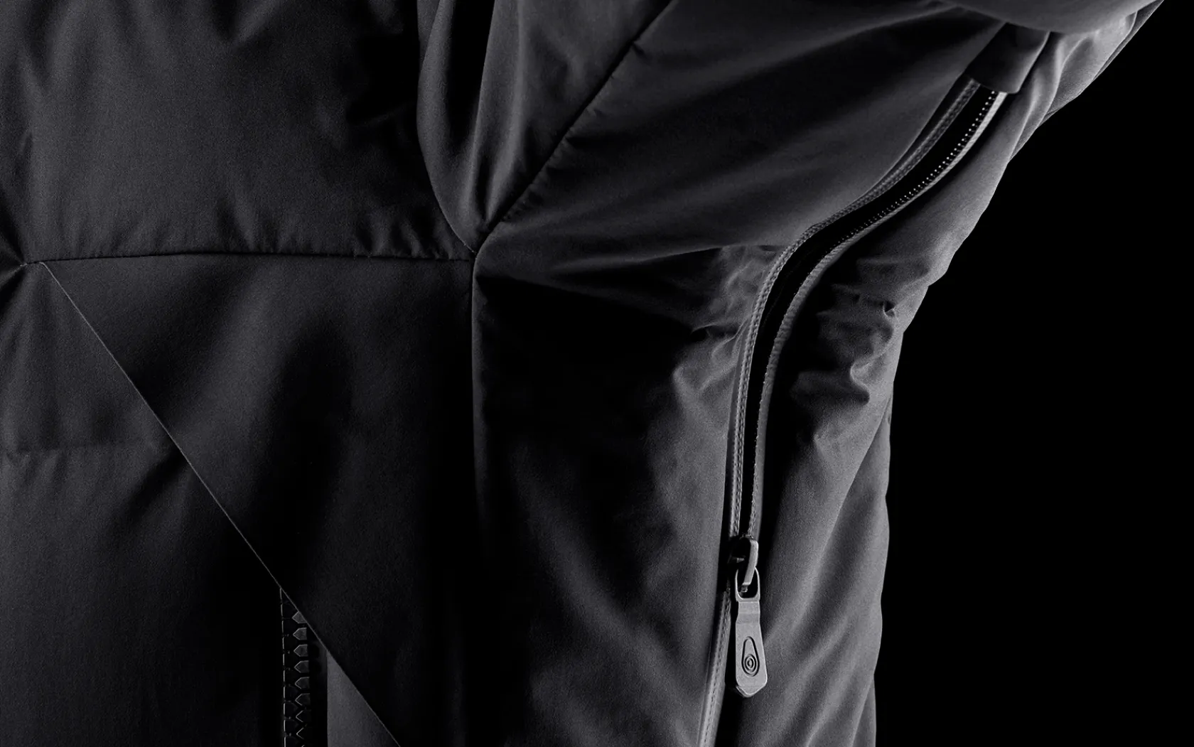 Parkan har en tvåvägs vattenavvisande YKK AquaGuard® Vislon dragkedja framtill med en svetsad knappslå i förstärkningstyg av VECTRAN®och nylon för att förhindra vatteninträngning. Ärmarna är asymmetriskt formade med ett längre avslut framtill på händerna för extra skydd mot kyla. Ärmsluten har också en inre mudd med elastiskt avslut för att förhindra vind och vatteninträngning. Jackan är utrustad med två rymliga bröstfickor med vattenavvisande YKK AquaGuard® dragkedjor och tre innerfickor, varav en med dragkedja för säker förvaring, samt två rymliga fickor i mesh med elastiskt avslut.r