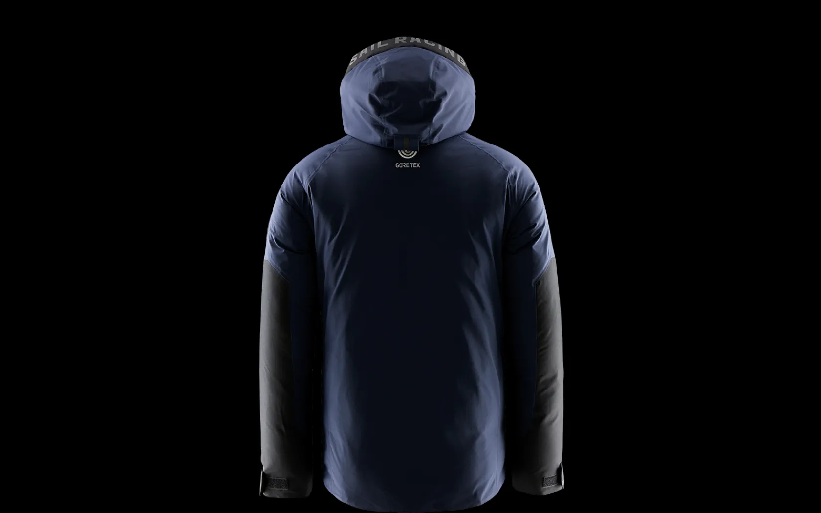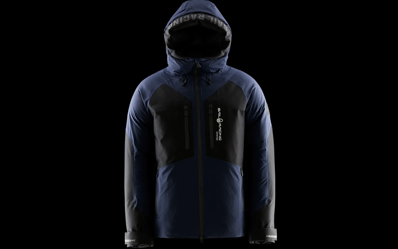 Antarctica tryck på insidan av ryggen och badge på ärmen. Sail Racing logga på huvan, ärmarna, bröstet samt hängöglan. Broderat Gore-Tex märke finns i nacken tillsammans med en Sail Racing logotyp. r