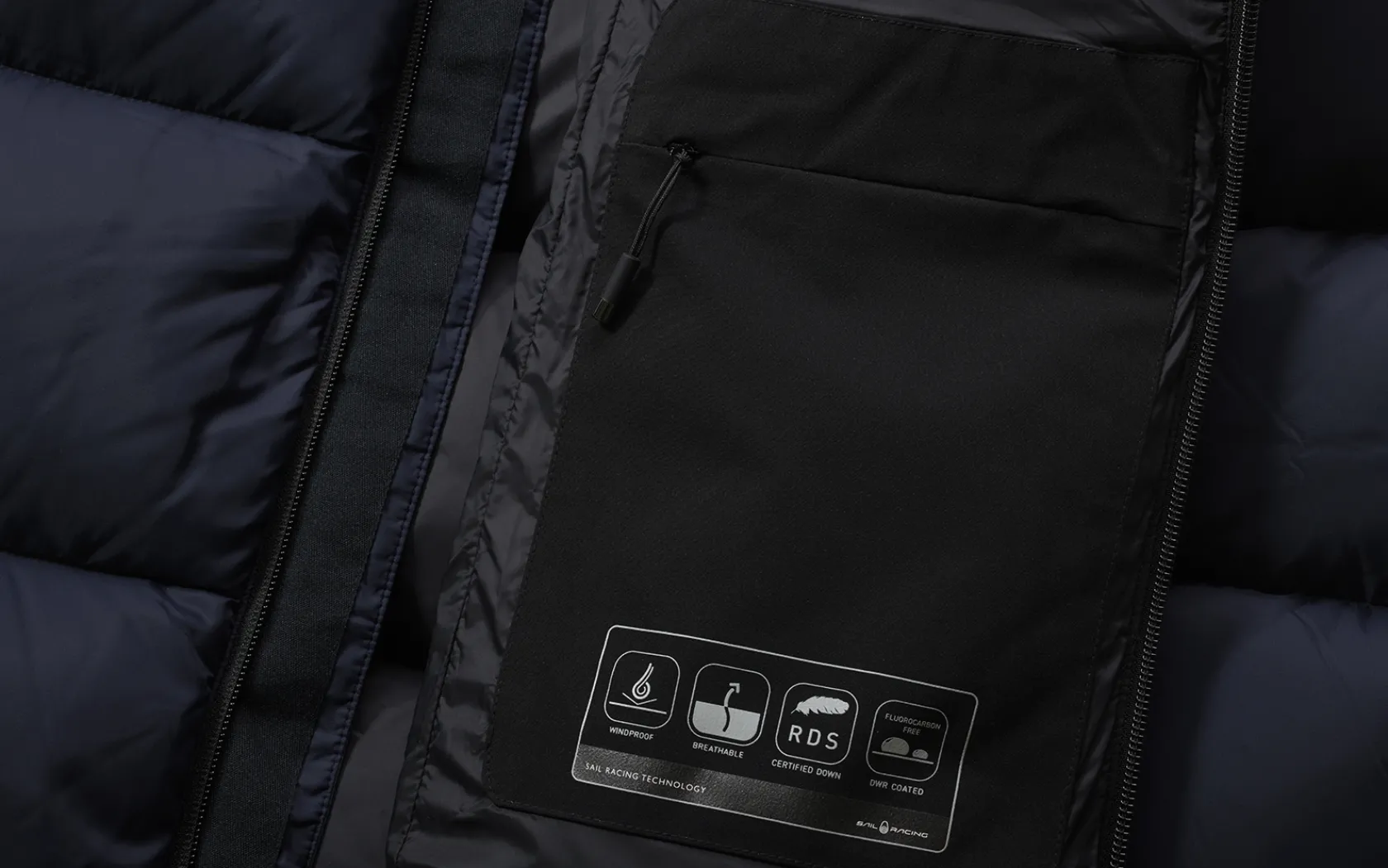 W Cloud Down Hood konstruerad i ett nylon ripstop-tyg med PFC-fri DWR-behandling för vatten- och vindavvisning. Isolerad med 90/10 Blue Sign och RDS-certifierade dun och fjädrar. Fill power: 700. Justerbar i nederkant och huva. Elastisk mudd och ärmslut i stretch-lycratyg. Omvänd dragkedja och midjefickor fodrade med fleece. Innerficka och Sail Racing logga på bröstet och överst på huvan.r